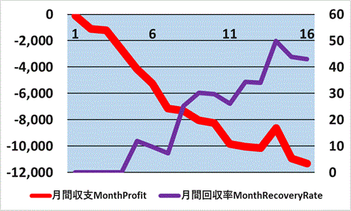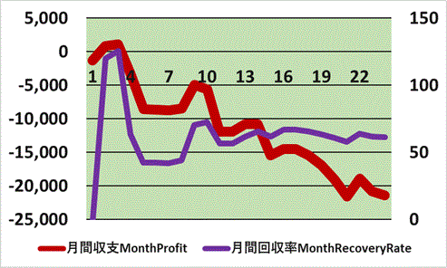| 5月 May | ![]() | 5月の前半もやばい。 いつになったら大当たりがでるのか。 結局、5月は100%回収できた日がなく終了。 月度の収支グラフは見事な単調減少。 これは今月が平均の下を行ったということであり、 来月以降に大当たりがあるということとプラス思考のギャンブル中毒者。 月間で21%かぁ。。。 |